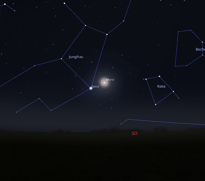 In der Abenddämmerung, tief am westlichen Horizont, kommt ab Mitte des Monats der innerste Planet Merkur zum Vorschein. Allerdings geht er früh unter, sodass er aus unserem Blickfeld verschwindet, sobald es tiefe Nacht geworden ist. Ähnliches trifft auch auf die Venus zu, da sie sich in der Nähe des Merkurs befindet. Somit ist auch unser innerer Nachbarplanet Venus nur kurzzeitig tief im Westen als Abendstern zu beobachten, bevor auch sie untergeht.