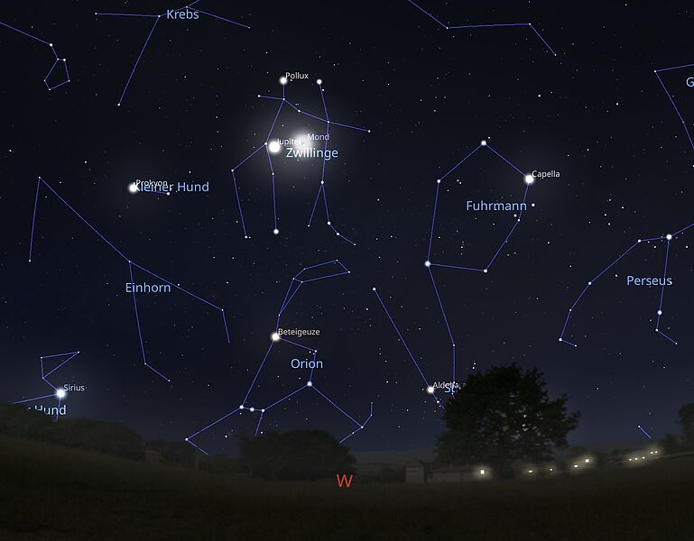 Richtet man den Blick hingegen nach Westen kann man unseren inneren Nachbarplaneten Venus nach Sonnenuntergang als Abendstern bewundern, bis sie selbst untergeht.