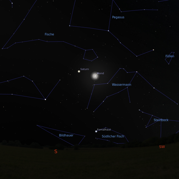 Auch Saturn tritt im Zusammenspiel mit dem Mond auf. Am 2. November sind sie gemeinsam zwischen den Sternbildern Wassermann und Fische zu beobachten. Saturn erscheint bereits bei Einbruch der Dunkelheit und bleibt bis etwa 3 Uhr sichtbar, wobei er im Laufe des Monats zunehmend früher untergeht.